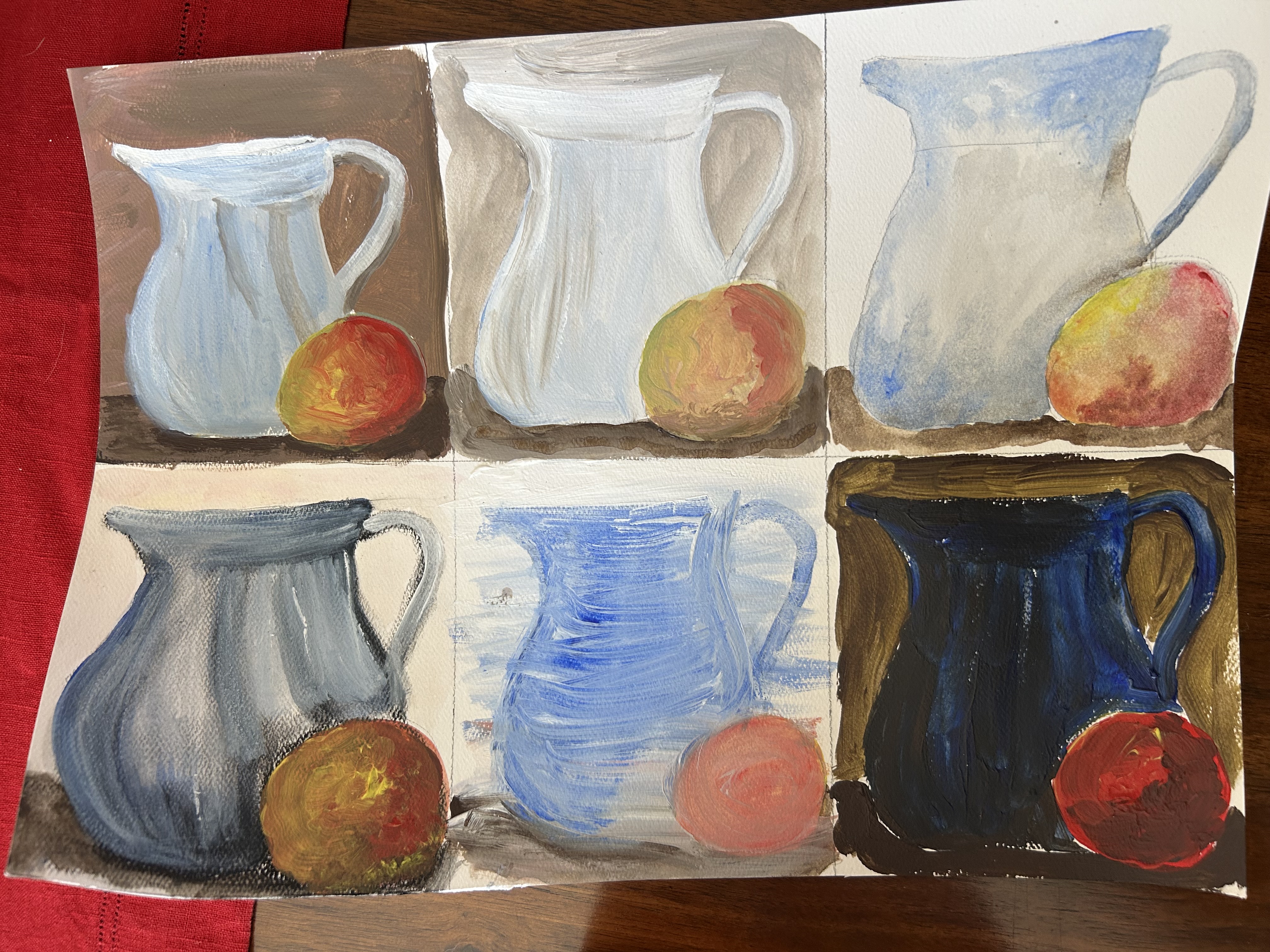 The first week we did an exercise of painting a pitcher and apple six different ways. It was a great warm up exercise and got us experimenting with different techniques.