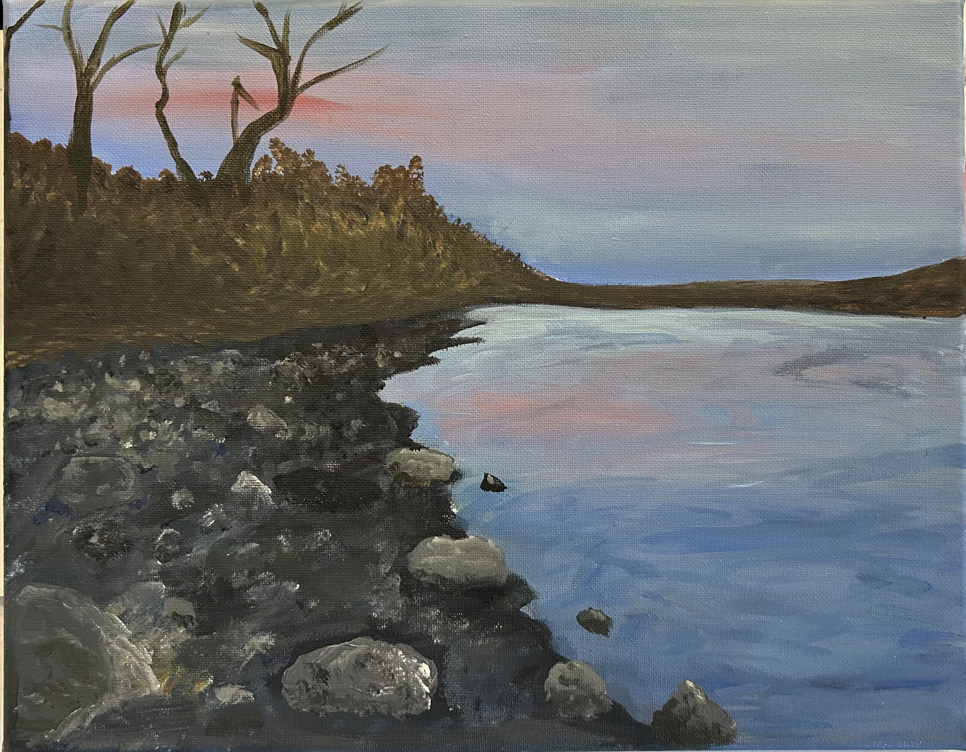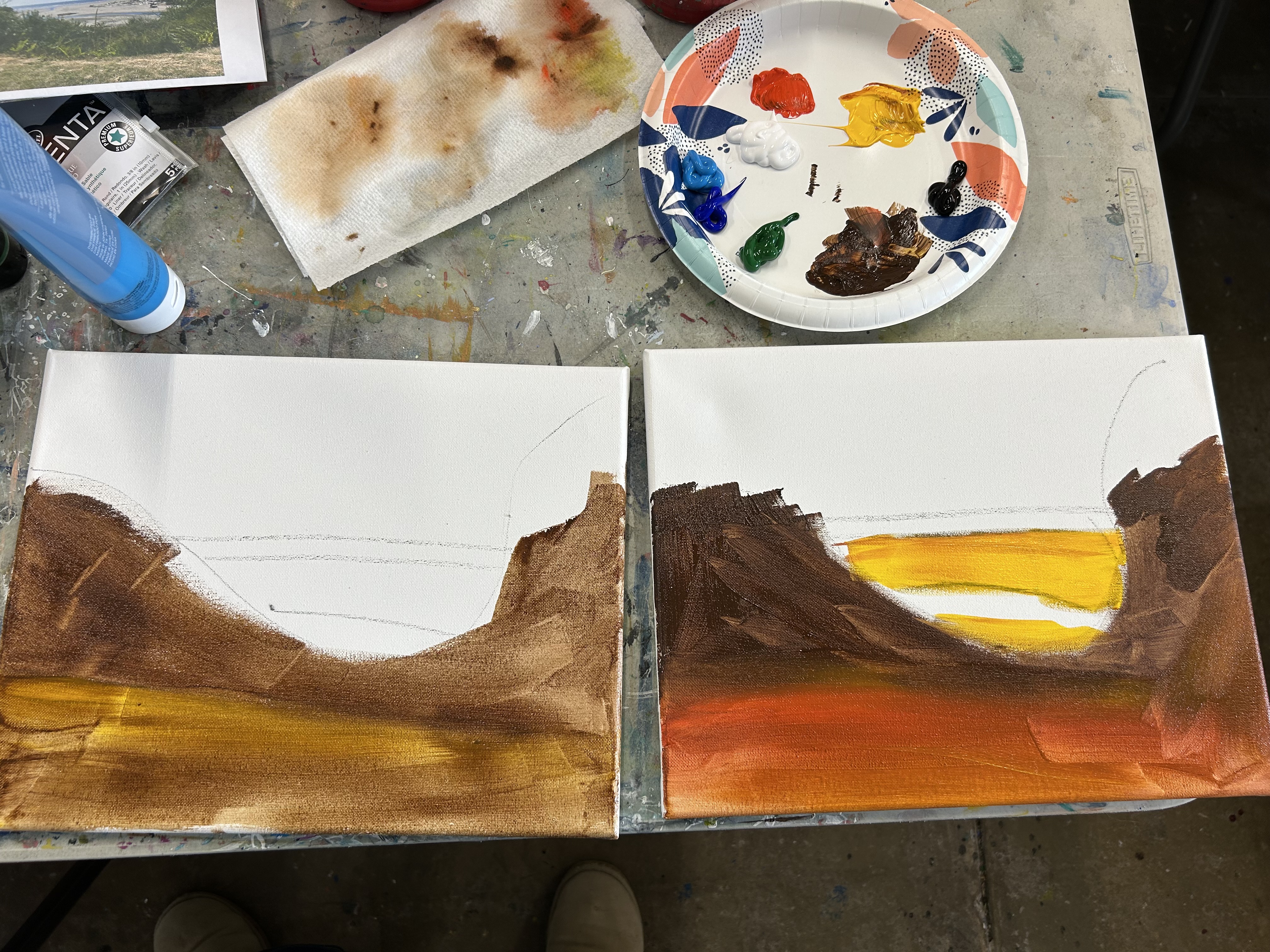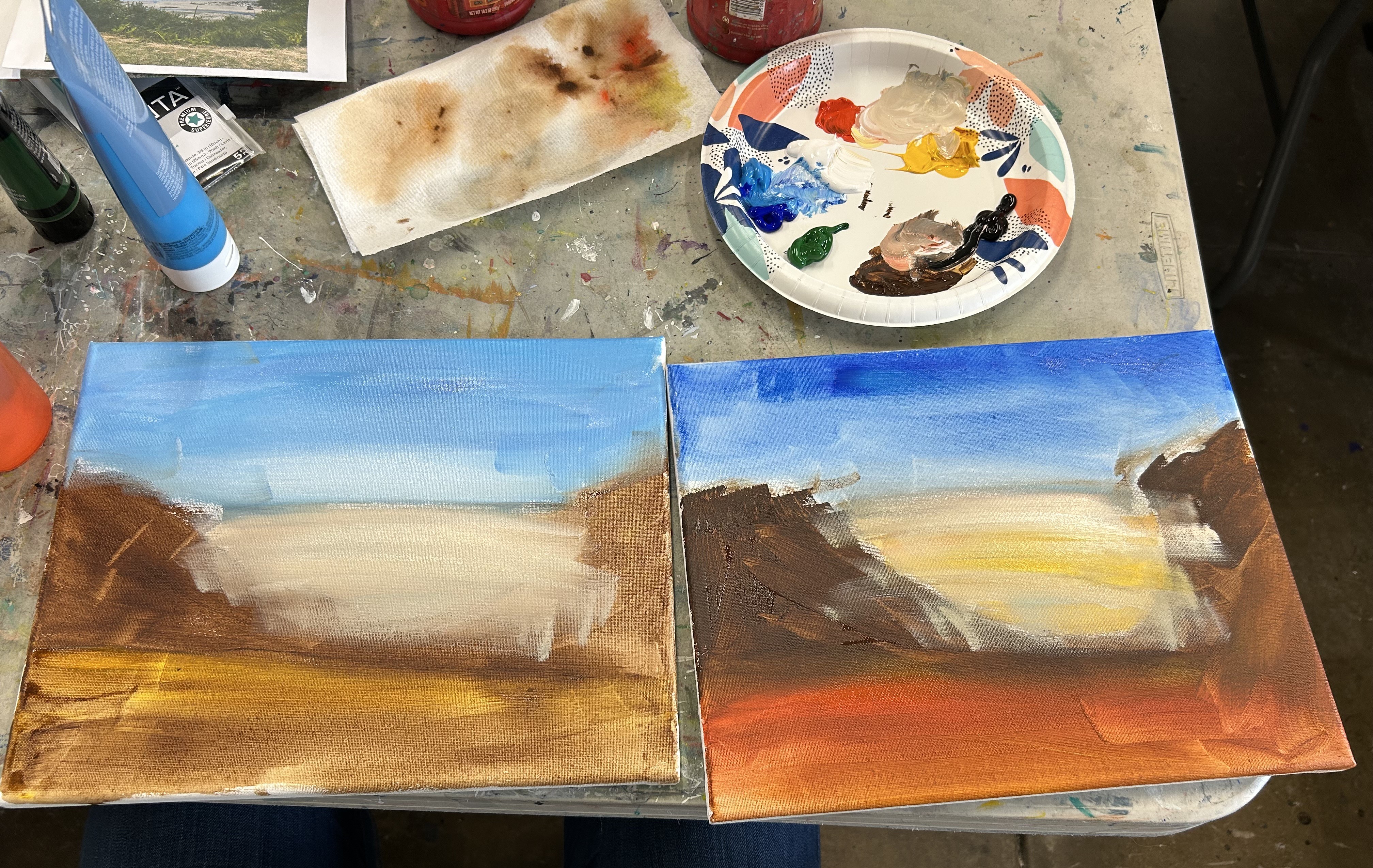 It was a very interesting exercise to paint two canvases at once. I felt more free to mess up and try something different. We also learned about underpainting, where you paint an opposite color underneath and allow some of that color to shine through the final layer. These are still a work in progress, but I’m pleased with the turnout so far.