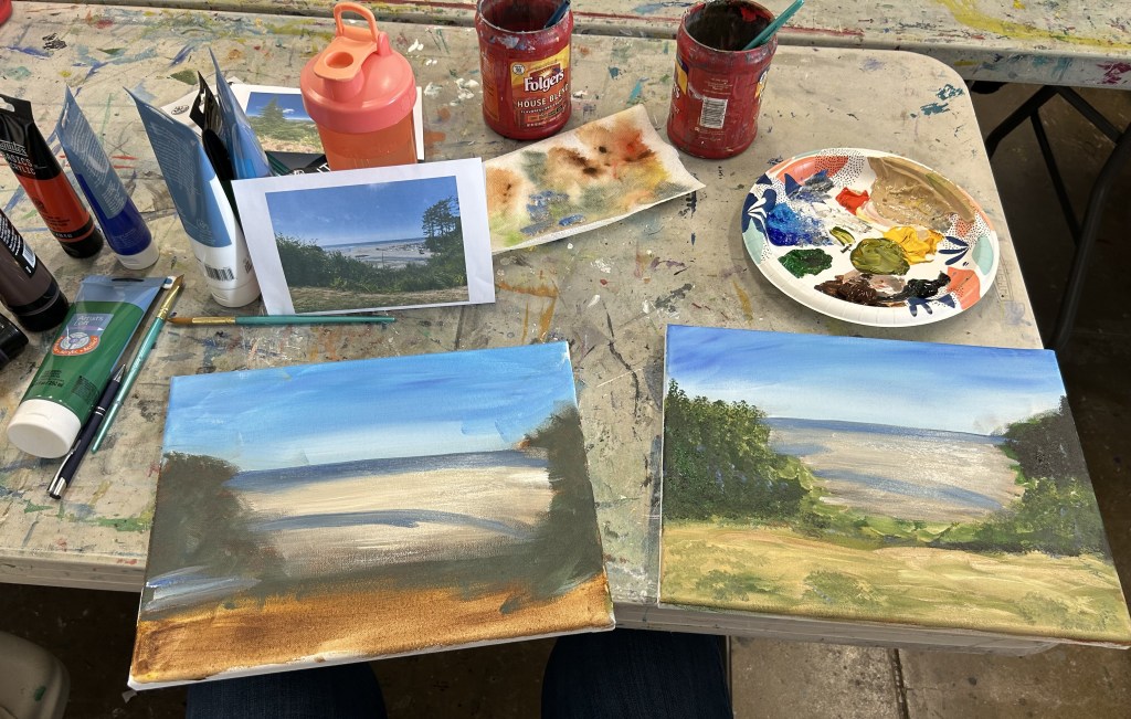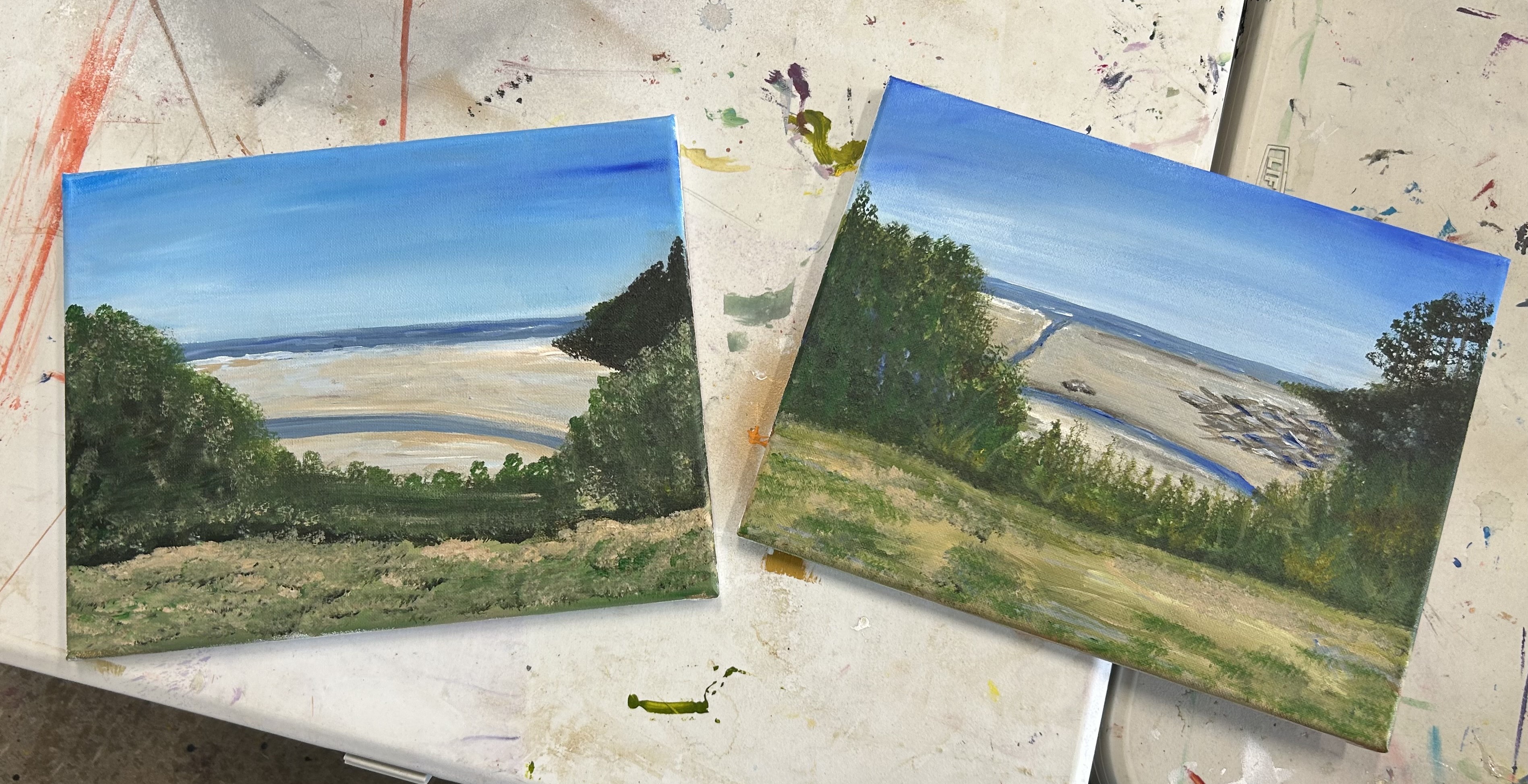 Week two we did two simultaneous paintings of the same landscape. This scene is from a beach in Washington State on the Pacific Ocean.
