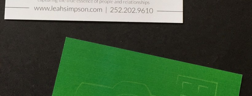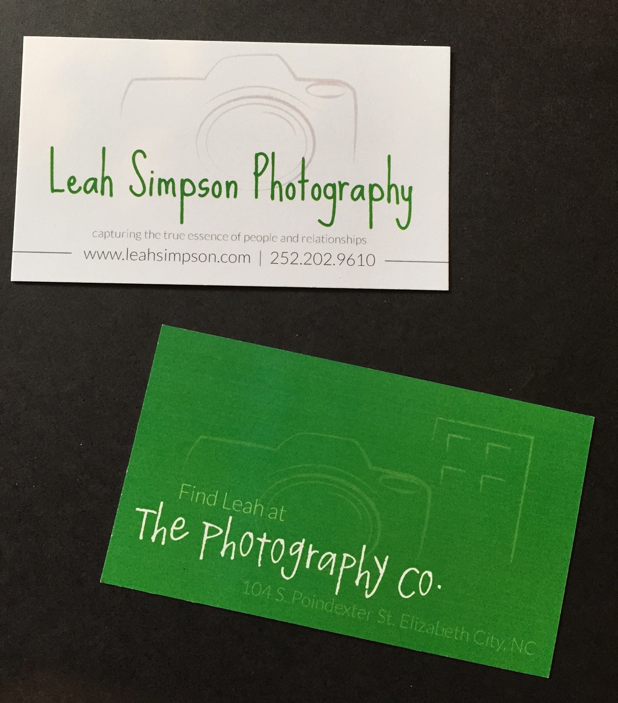 Leah wanted a business card for her personal photography business Leah Simpson Photography that incorporated her connection to The Photo Co. These business cards use part of the logo from The Photography Co. since she is part owner of the studio. Many of her sessions for Leah Simpson Photography are done outside and so the green reflects the connection to natural settings.